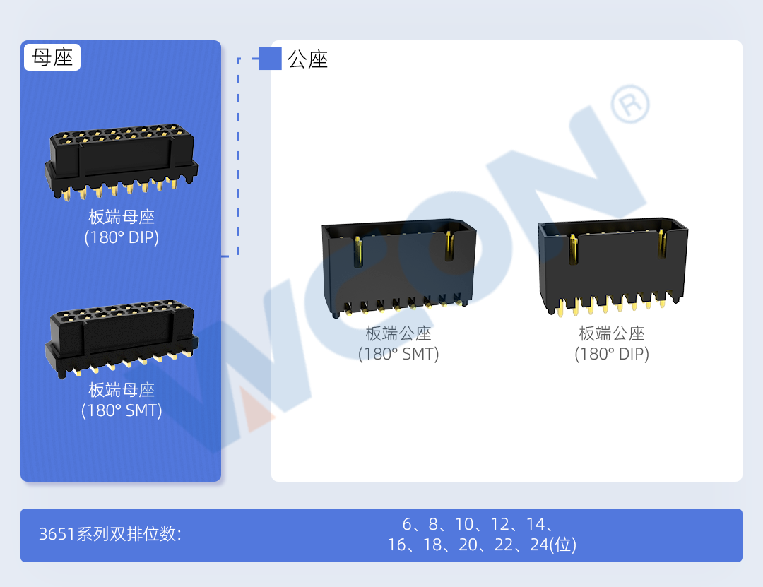 3651系列是一款1.25mm間距小體積、高性能,能為設(shè)備提供穩(wěn)定信號傳輸?shù)陌宓桨暹B接器。產(chǎn)品帶有定位柱,方便精準(zhǔn)安裝到電路板上。有公座 180° SMT、DIP;母座 90° SMT、 DIP等多種形態(tài)可配合,36種型號可供選擇。